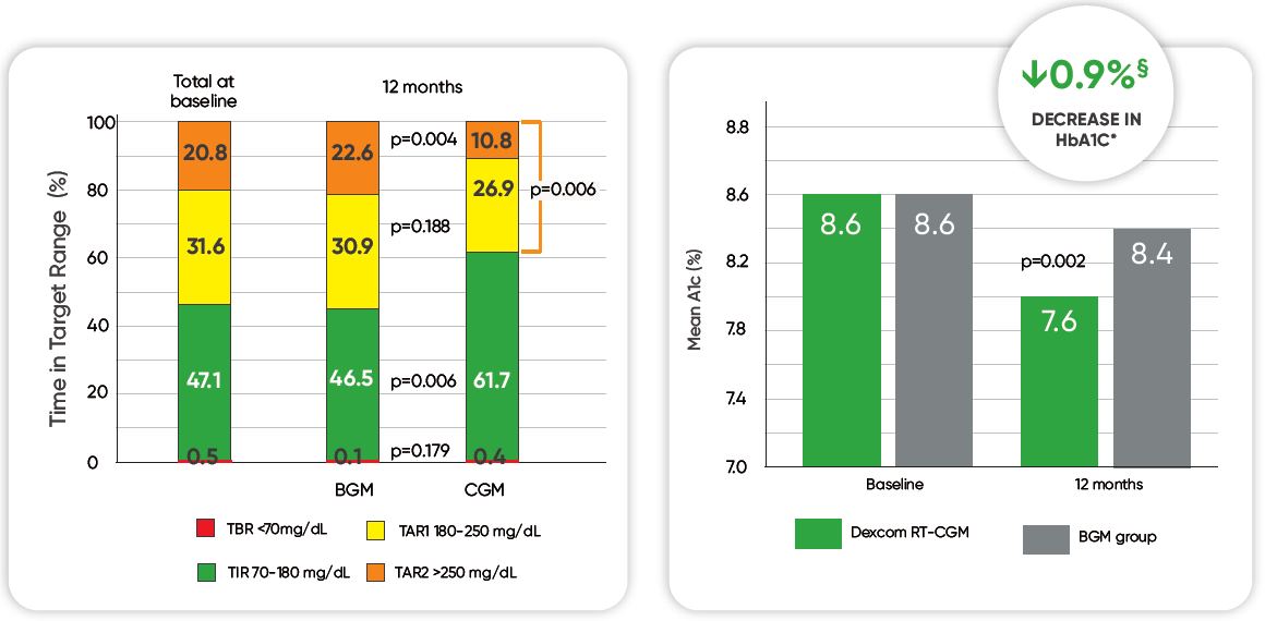 - Significant improvement of TIR2 in the Dexcom RT-CGM treated group compared to BGM treatment at
